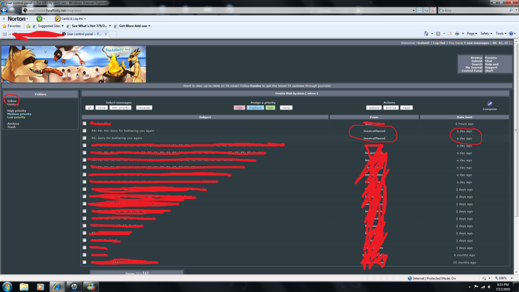 July 9: JE's DA account get's hacked and "meme", "Dirty Beaner", storing pictures and putting on mature pics with no tag on them. JE gets banned on DA while FA account is untouched.