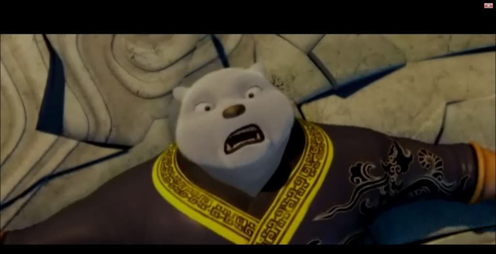 While watching, there were few things running through my mind. The first, is the villain. If you've seen the trailer, the villain is a panda but once you've seen the show, HE'S NOT A PANDA!!! NO!! SERIOUSLY!! He's NOT a panda! This badass villain (whom is quite a hotty and muscly in my opinion under his shirt) is a fucking white bear! As in, i think it's a polar bear. He paints his eyes and ears black! I mean.. WTF?! They didn't even say the reason why he painted himself black. Sheesh! Somebody, please, if you've seen this movie, please enlighten me on why he painted his eyes and ears black to look like a panda.