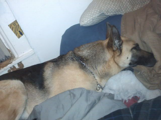 Several months ago, early in the morning, after staying up until 6AM the previous night, my room mates phone explodes about 8AM, and I mean EXPLODES, it won't stop going off, and he finally wakes up and answers it, and it turns out that it is a friend of his from where he works, who does voultneer work for a local vets office. He talks to his friend, and then comes barging in to my room demanding I wake up, and we need to leave that instant. I growl and roll over and growl, telling him he can do do all sorts of colorful things to him self, since I had a whole 2 hours of lousy sleep. He tells me "DO YOU WANT A GERMAN SHEPHERD??? WE HAVE TO LEAVE RIGHT NOW, THIS INSTANT" and told me the circumstances. He didn't need to tell me another word, I flew out of bed and was running out the door with my pants hardly on, and I didn't even bother to ware shores.
