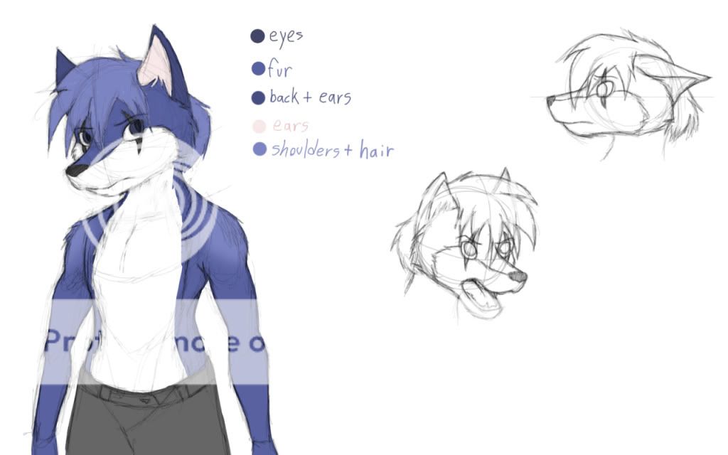 Description: his belly is white, and it runs up to under his nose. His sides are Light blue sides and arms, and his back and ears are dark blue. he got onw dark line ove each of his eyes, and he only uses pants as clothing.