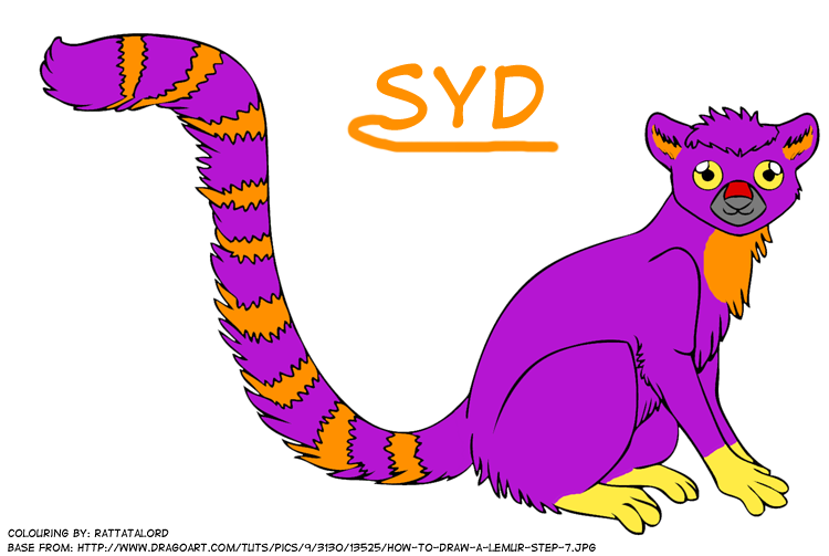 He has a purple fur coat. His "rings" alternate between a bright orange color and the color of his purple fur (though the marks on his tail always start with purple at the base, and end with purple at the top), and a patch of fur on his chest is the same color of orange. Sid's hands and feet are yellow, as well as his eyes (though his irides are brown, and his pupils are black). He has a sort-of muzzle: His nose is big and round, and can be colored shades of grey and brown (the color of the nose doesn't really matter). On the tip of the muzzle is a small streak of red. The same color of red is seen on the inside of his ears, too.