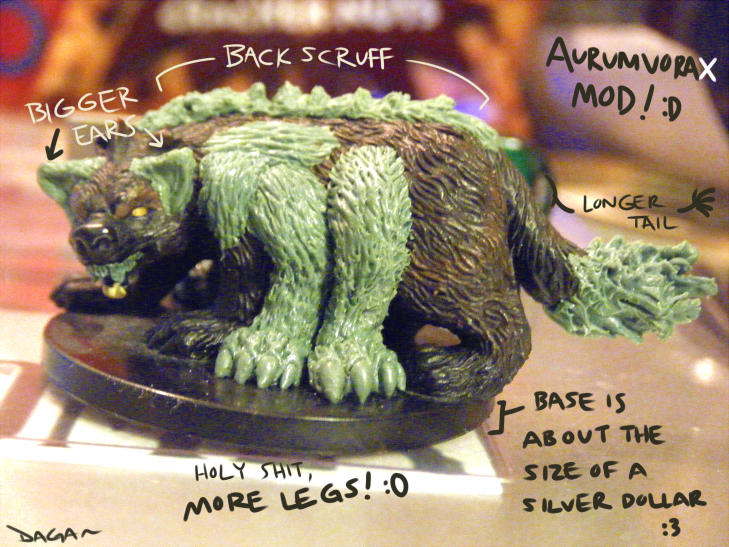 You can tell where my modifications are sculpted in green (ears, crappy teeth, legs, end of tail). There's also another extra set of legs on the other side of the mini as well. The plastic base that it's anchored to is about the size of a silver dollar, if that gives you an idea of how big it is. >w<