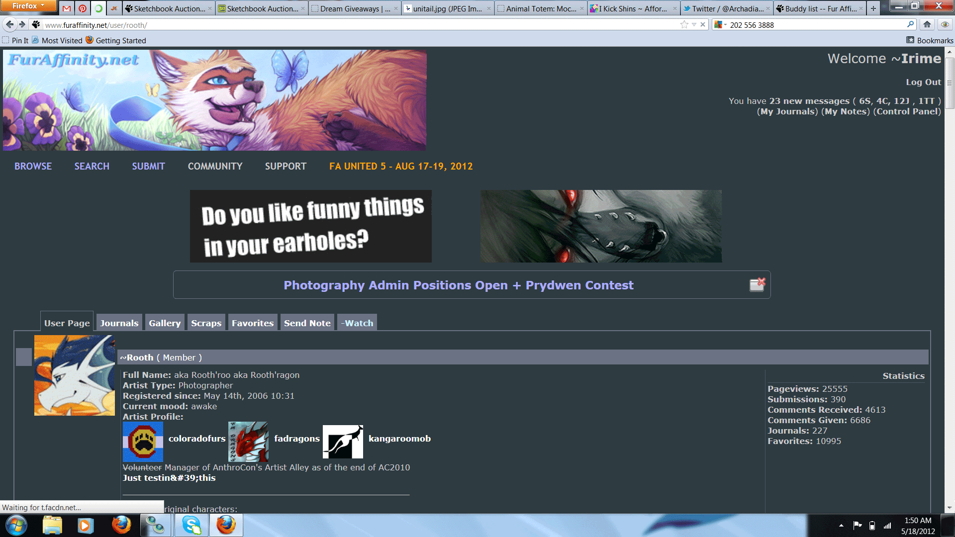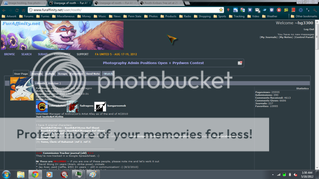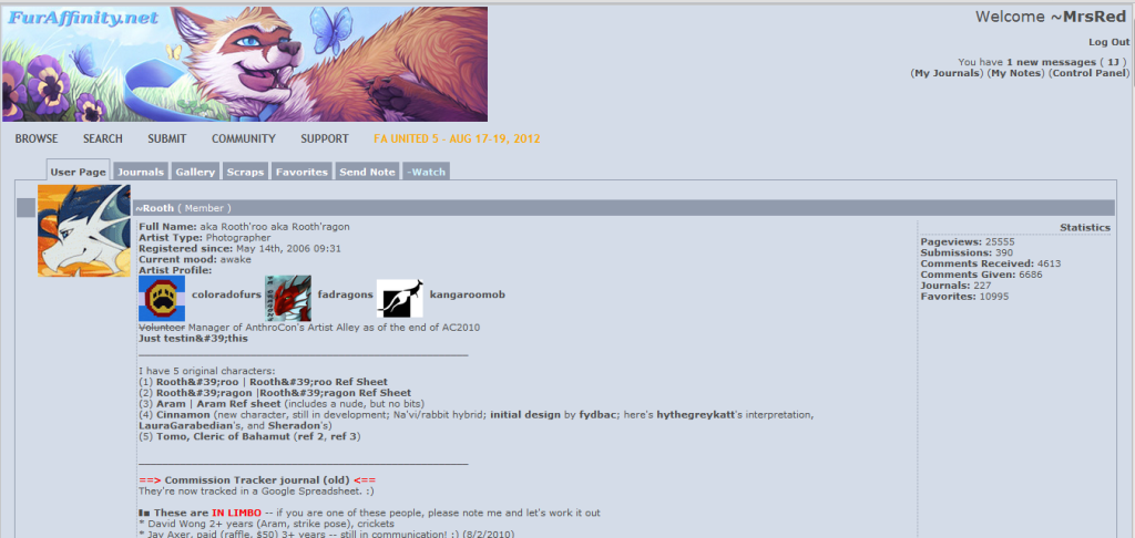 4) I will randomly choose a winner from the users with valid comments posted. Remember, if your comment doesn't have a link to an FA artist in it, it won't count, even if it has a valid screenie. And remember, if your screenie doesn't meet the requirements of #1, your comment won't count, even if you have a valid FA artist. Then I'll get with you and we will pick an artist you will commission. As stated earlier, it has to be an artist who has done art for me in the past. Easy way to find most of them is to browse my gallery, and/or use FA search to search for "rooth".