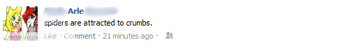 I then told her that, yes, spiders are obviously attracted to crumbs and that's why they build webs, so if a crumb comes wandering along they can get tangled in it so they can't escape.
