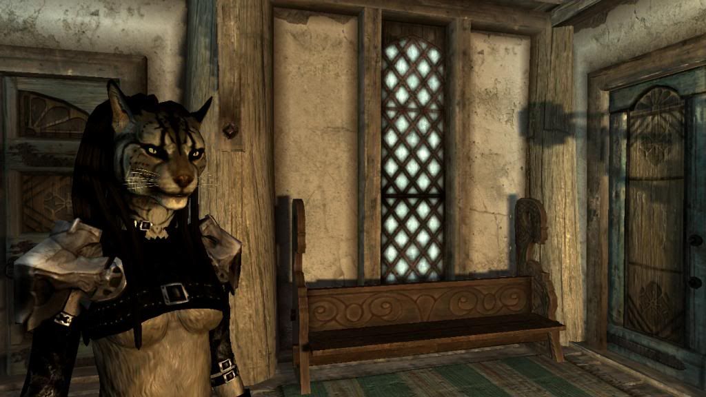 It would be of her and she looks like this khajiit from my game and I could provide pictures of the body so you knew markings and stuff but background umm I guess something simple like a wooden wall with a cloth hanging up like a kind of medieval setting