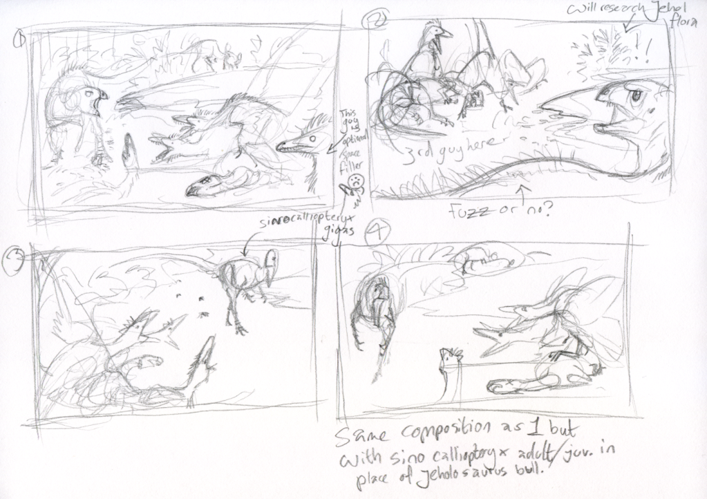 A bunch of sinornithosaurus inviting a jeholosaurus to dinner, got it. I'll see how the image goes in regards to the background; I don't want to crowd it out with detail, especially with the little fuzzies.