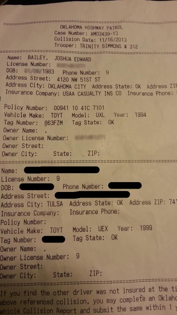 But no until I get more information from the Oklahoma Highway Patrol or the official collision report comes out I don't know much at all about the impact because I was knocked unconscious pretty early in the wreck and don't recall any of it.