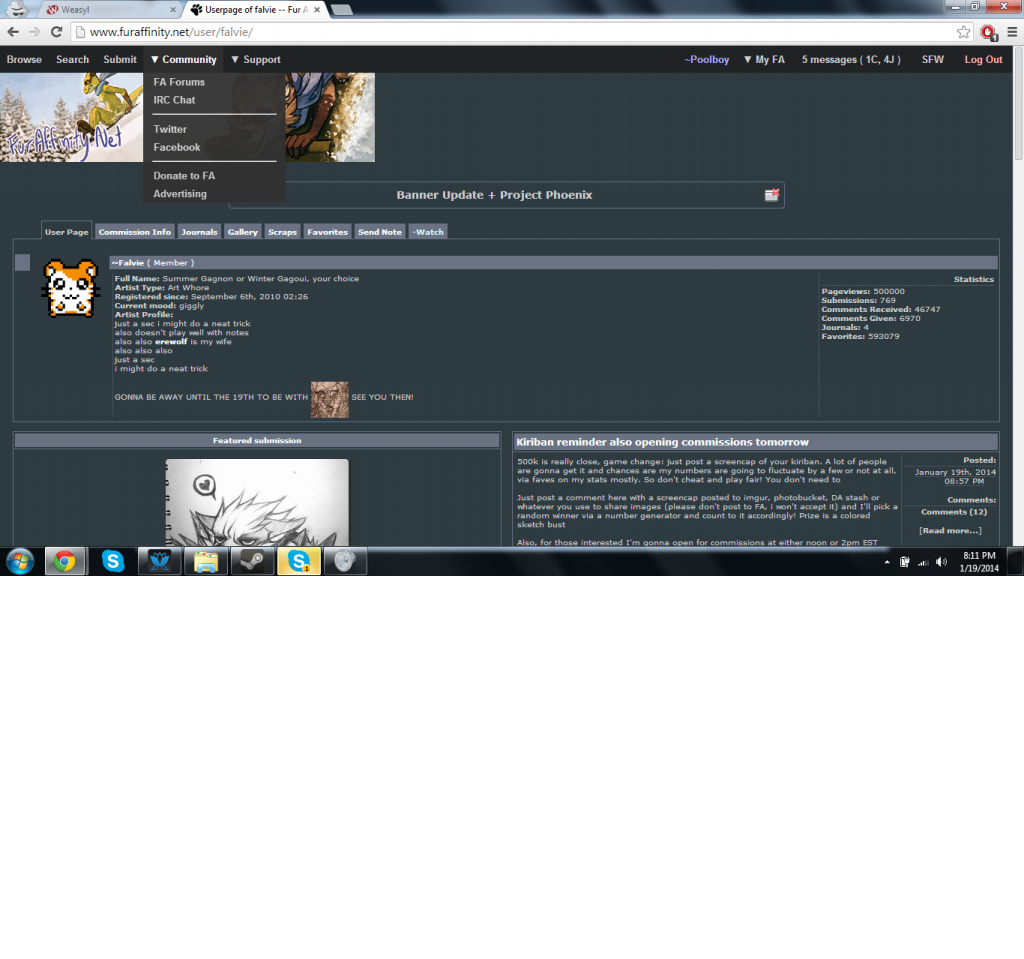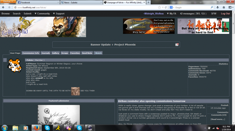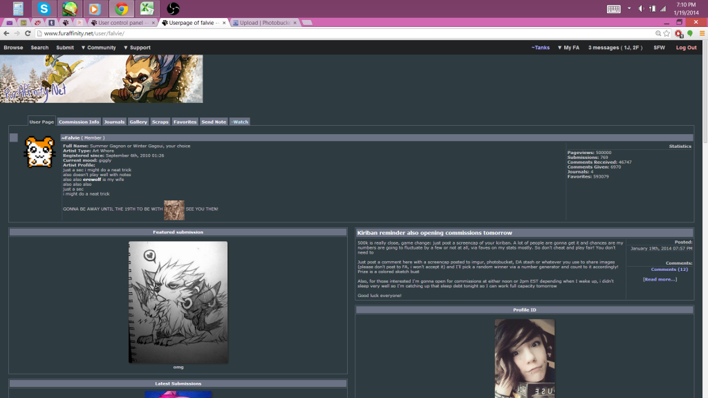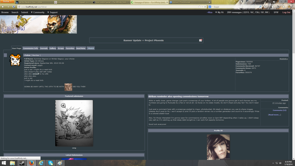 Just post a comment here with a screencap posted to imgur, photobucket, DA stash or whatever you use to share images (please don't post to FA, i won't accept it) and I'll pick a random winner via a number generator and count to it accordingly! Prize is a colored sketch bust