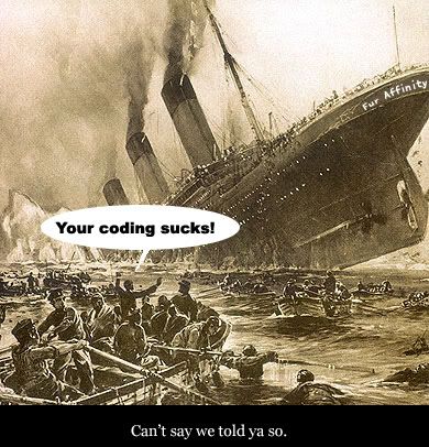 But no. Dragoneer, desperately clinging to his e-fame at every last cost, is willing to stay onboard his burning decrepit ship in order to wear the title of captain, even if afterwards and during the sinking everyone around him thinks of him as being naught but the terrible leader of a shitty-ass ship. And his userbase, also desperate to stay aboard the floating carcass long after it should've sunk, go down below with him, despite there being more than enough lifeboats and jackets to paddle on to better ventures. That's FurAffinity for you, and unfortunately even after the site inevitably goes down, it will still be a laughingstock for years to come.