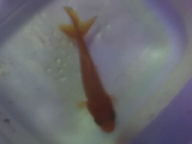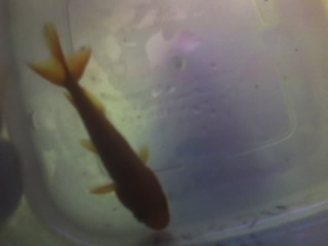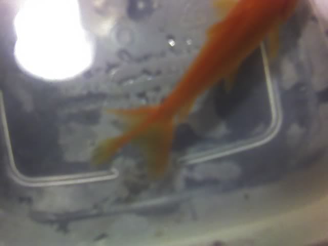 Now you can see there are kinda 3 darker lines at the tail. the ones on the left and right are the bottom of either tail and the one in the middle is where they connect at the top. I looked on the internet and it seems that its normal for the 'fancy goldfish' to have weird tails but this just a comet goldfish like one would win at a carnival or fair. Because of his oddity, he will be spared certain death. (that being because he was purchased as a feeder and would have been fed to my arowana). His name is Gerald Fitzgerald :D