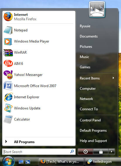 SO! If you're bored, take a screenshot of your Start Menu, upload it to Photobucket or some other site (not FA, it isn't allowed), link to it in a comment and tell me what it says about you. Or let me look at it and tell you what I think it says ;3