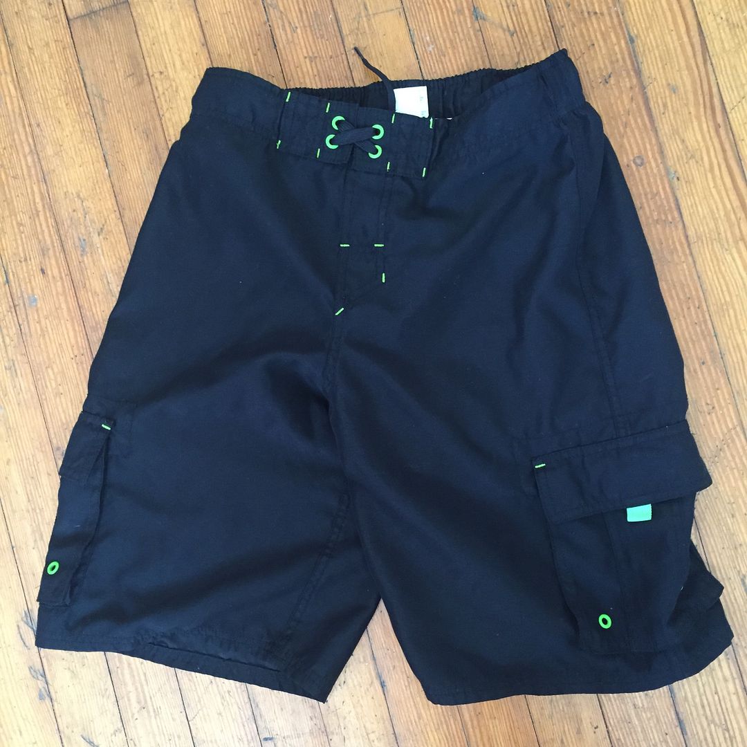 Top is just a regular black bikini top, bottoms are a pair of black and green swim trunks like this: