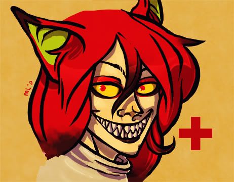 as for me http://www.furaffinity.net/view/2573602/ in human form with an evil toothy grin and if you want artistic freedom I really dont mind the expression