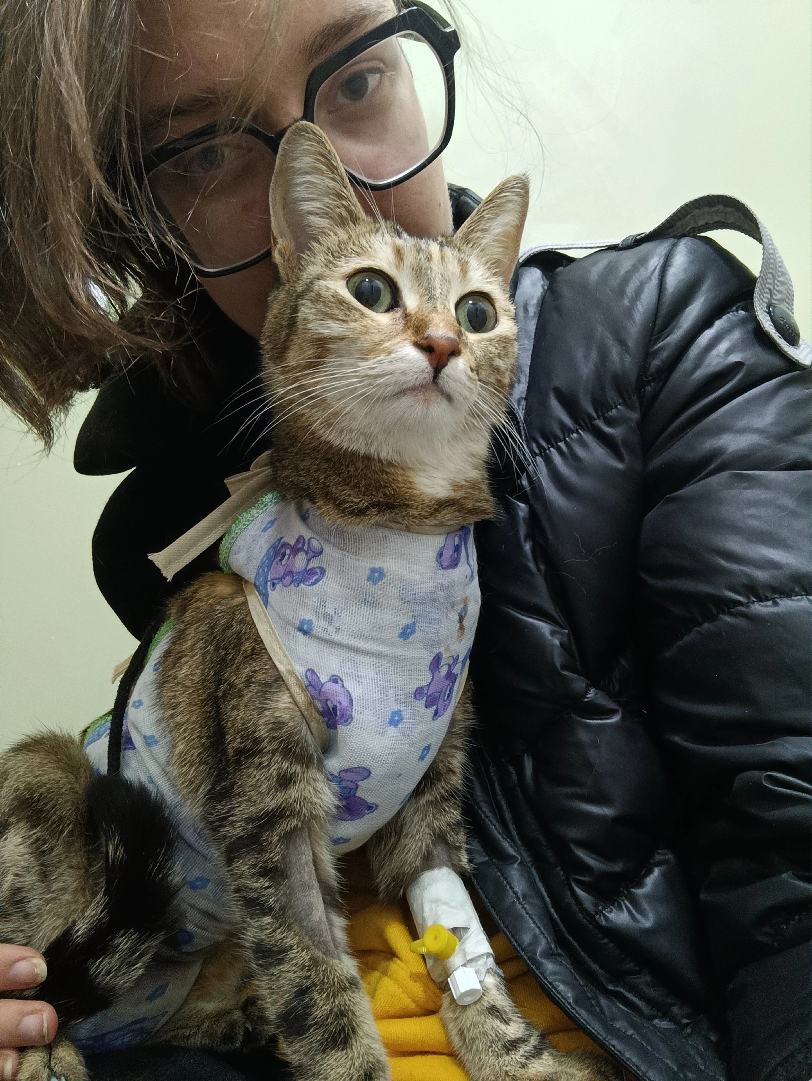 And right now I'm in another city with one phone and my second cat after surgery. I am very scared, I am very afraid of losing her, because the situation is quite unstable.