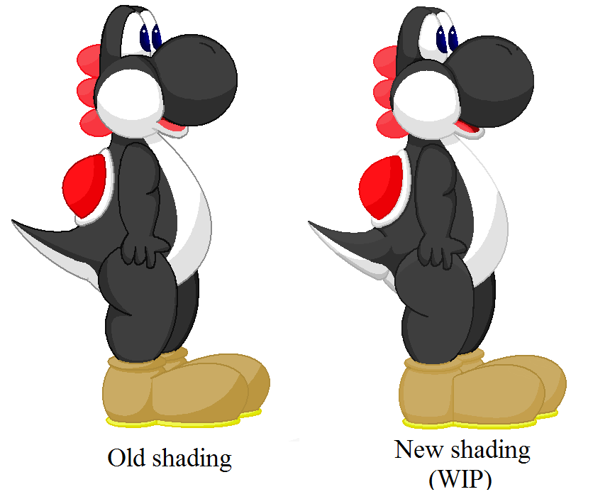 - Also, a while ago, I decided to try to see if I could improve upon the base drawing of Yoshi I use as a reference. Here's a comparison drawing showing how Yoshi looked before and how he looks now.