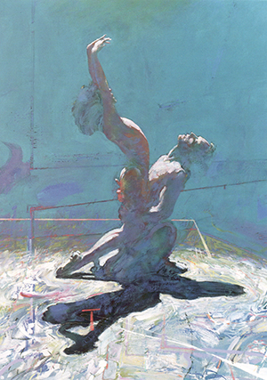 Much more modern, this guy was really prevalent in the 80's and is know for his paintings ballet dancers and broadway imagery. He was working in New York and this all very much part of that time and place. His stuff also has this finished/unfinished quality that looks evocative and dreamy, showing dancers practicing. Perhaps themselves unfinished as they learn the routines or stretching, etc. It all feel very casual and light. Very good, tight, focused drawing underneath, but the painted surface feels distracted and ephemeral, beautiful. Those lines and smudges and marks in some images can seem like pure abstraction, but they are the lines of fresh and old tape on the floor, marking beats and paths and stop points. The scuffing from shoes on grubby dance studio planks becomes the scuffing of paint on the canvas. So it's observed reality, but looks like abstracted painting, and serves as both, really.