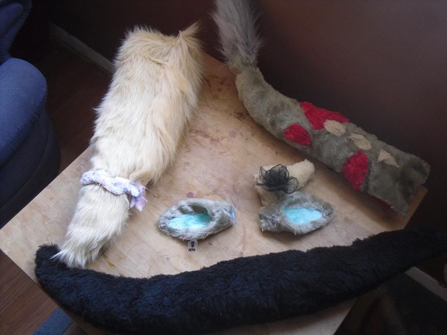 2 tails I've finished (With help from Fara :3), 1 half-finished one (Tuss's one), a set of ears with one horn and a rose (making the broken horn some other time)