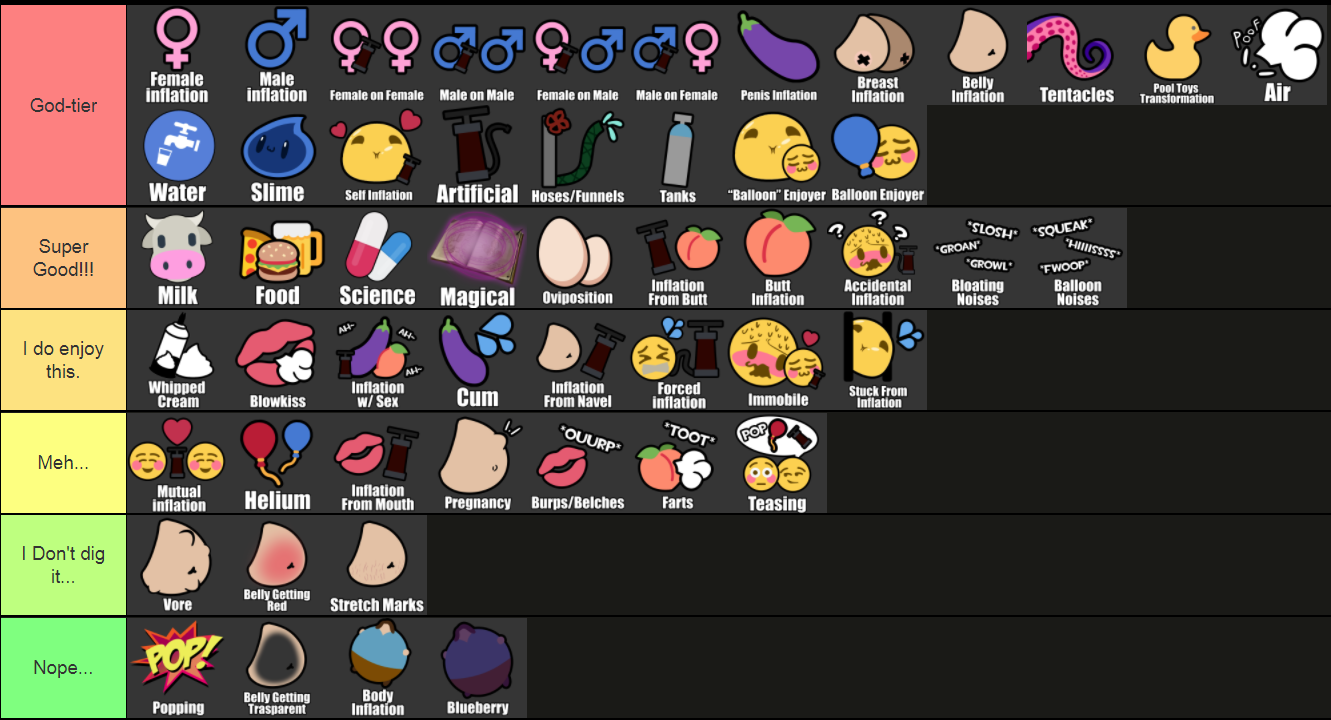 Among the kinks Inflation is the most favorite (11 votes). Hyper and Latex follows it having 8 votes each. Unusual outfits and interesting situations are on the third place with 6 votes. Then with 5 votes follows Diaper kink. And the least favorite kink is Weight Gain, with just 3 votes.