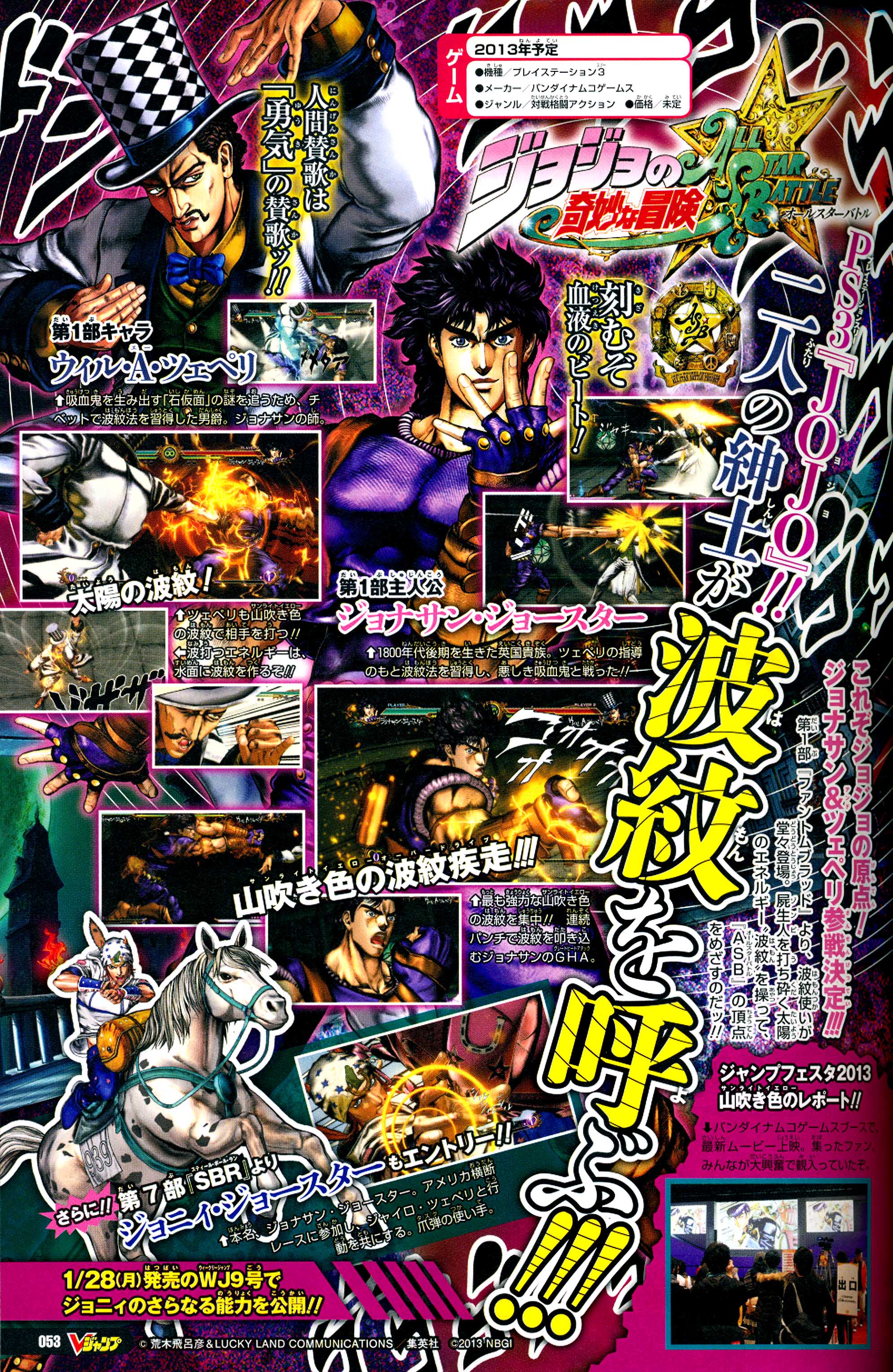 Also, a few other things to be mentioned. A larger scan if the recent All-Star Battle character reveal has been found. In it some things are much easier to see such as Jonathan using Bruford's Pluck and Luck sword and Johnny using Tusk Act 4 as his super move. Tusk Act 4 is apparently very pink.