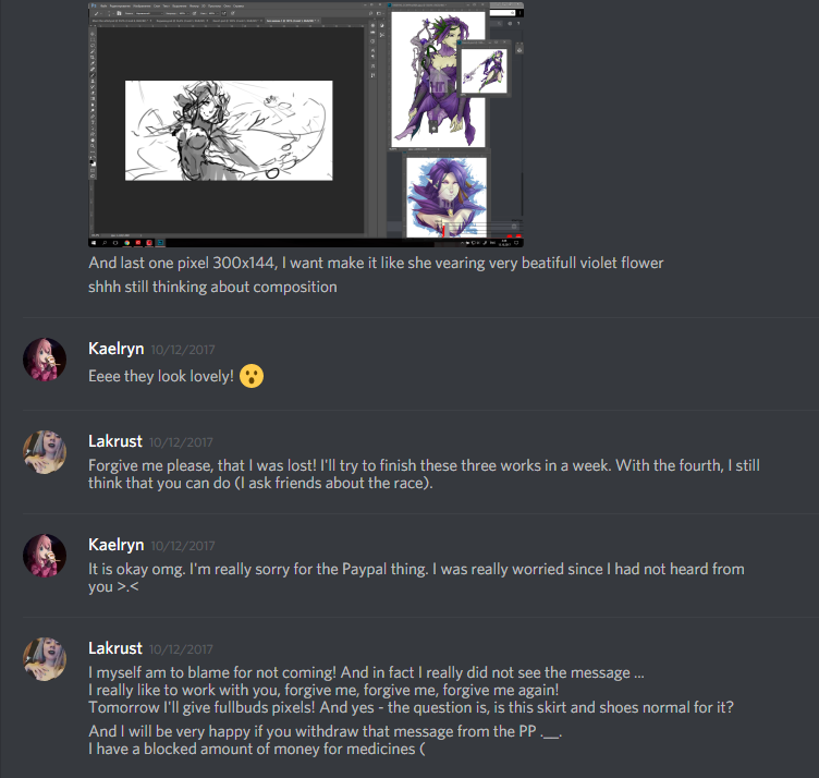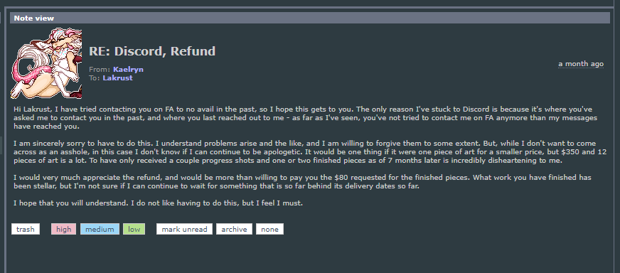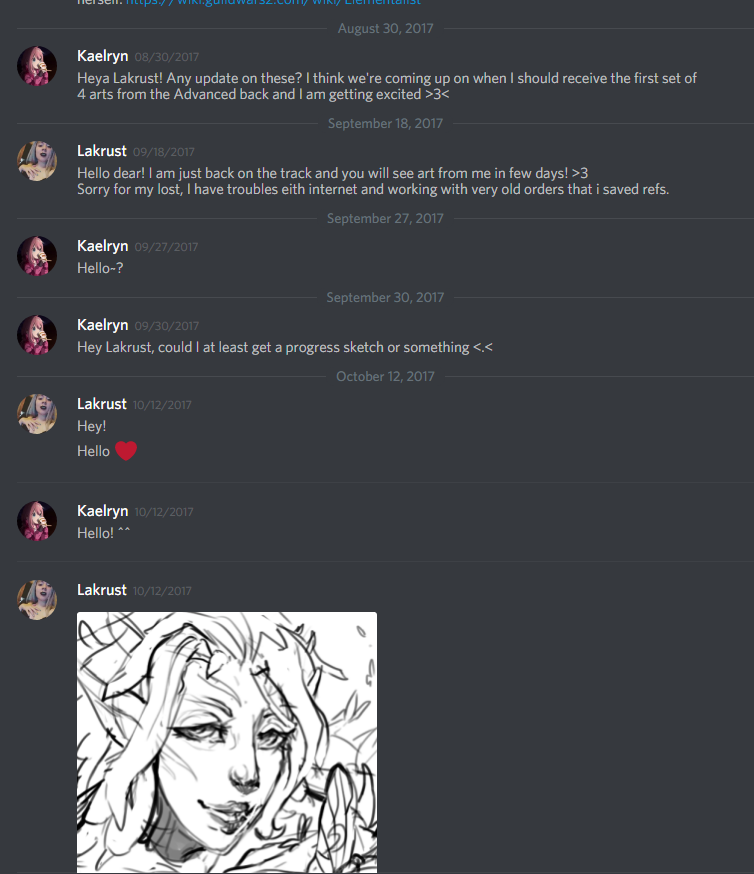 It was during this time that I first tried to get in contact with Paypal for a dispute, because it was starting to get to me that I had seen literally nothing of the art I had purchased. The dispute made its way to Lakrust, apparently, because it seemed to be the reason she got in contact with me.