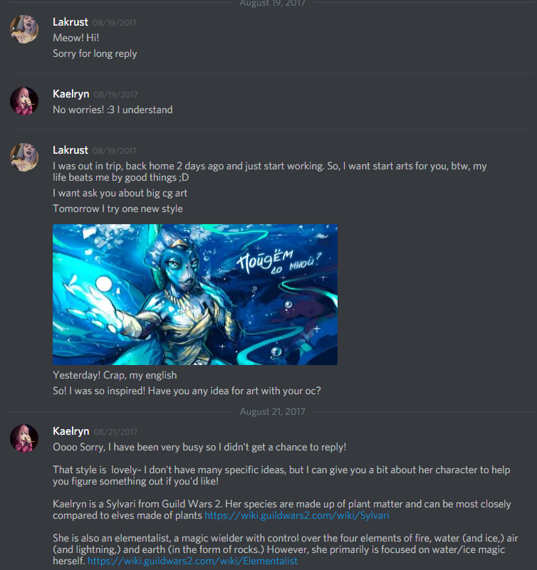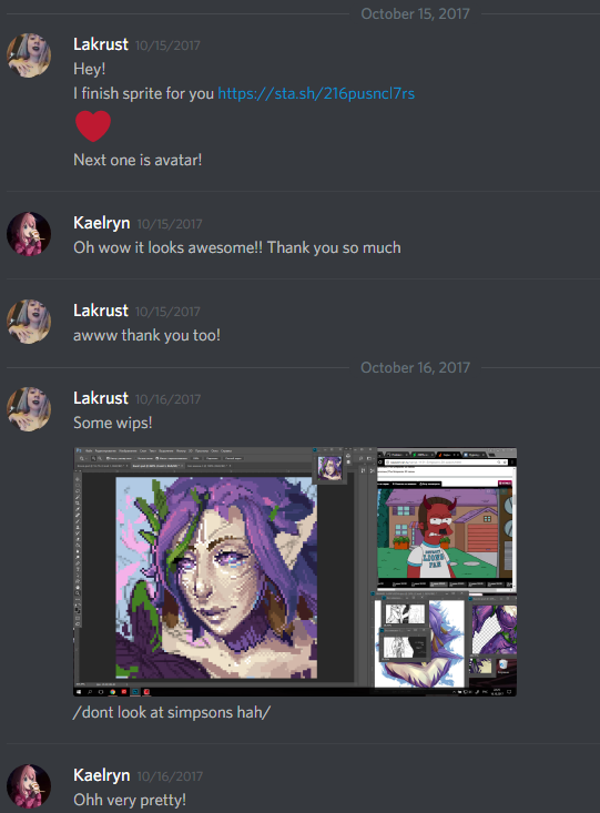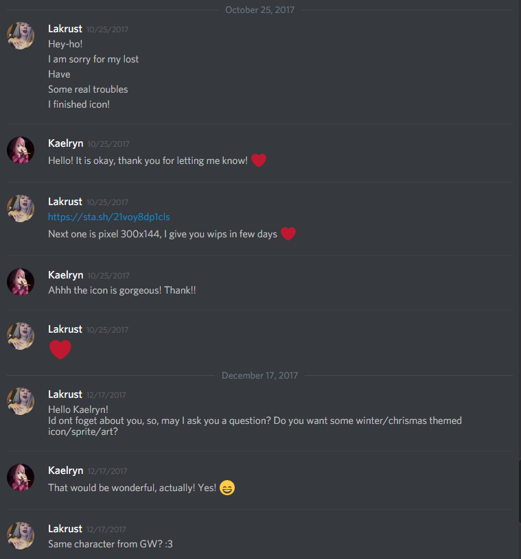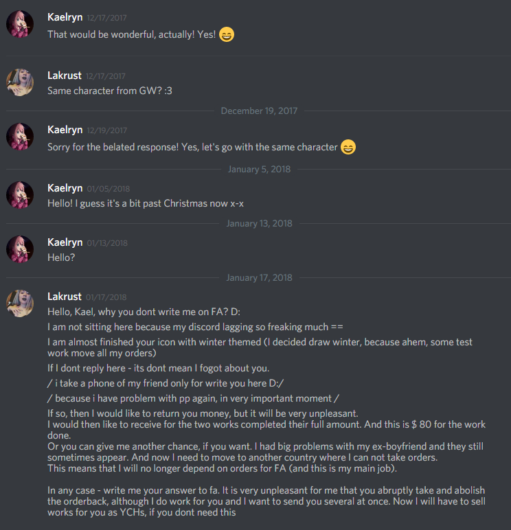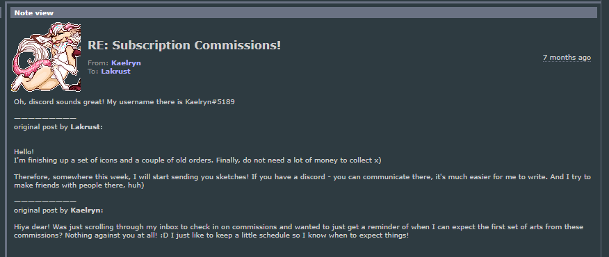 Come July, I decided to reach out to her on FA to get an update. She was happy to provide me her Discord username so we could get in touch, and claimed she had been busy with some other orders - no big deal! I totally understand having a busy schedule! And so, I accepted and we began talking on Discord.