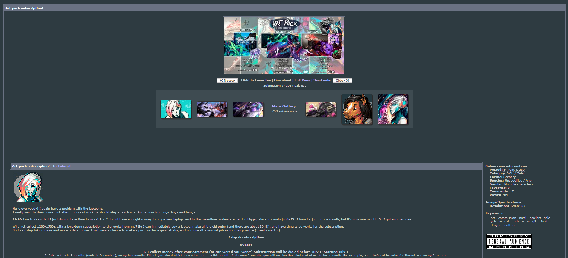 Lakrust, an artist that I had worked with before posted a neat deal where you could pay a flat price for a sort of "art subscription" where you would receive one or two pieces of art a month for a flat price of $250, $350, or $500 in order to help them save up for a new computer to make art on. I loved her work and so I spent some time saving money just to be able to afford the $350 pack. By the middle of the month, I had saved enough and placed my order.The original art offer on her FA page