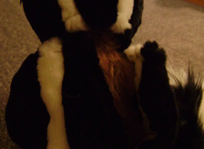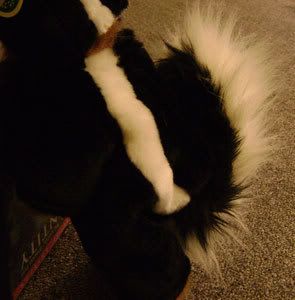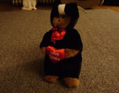 Posted 18 years agoThis past week Mary made an excellent find at our local grocery store. She bought me the cutest little skunk-fursuiting bear! I didn't realize they made these but its a little bear wearing a skunk custom holding a love stinks heart! Thank you Love!