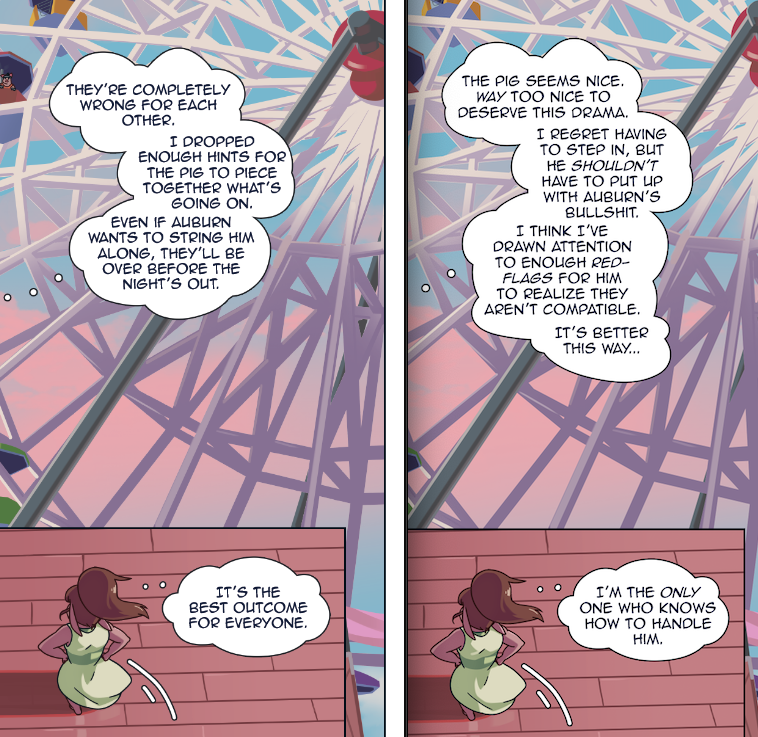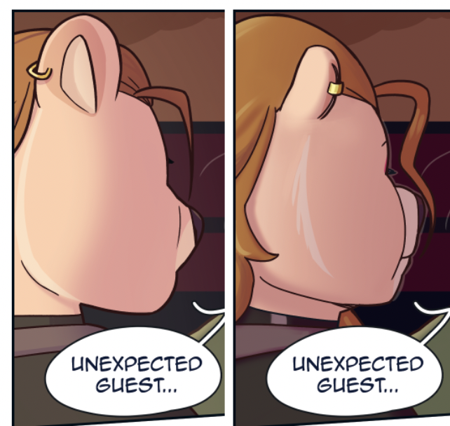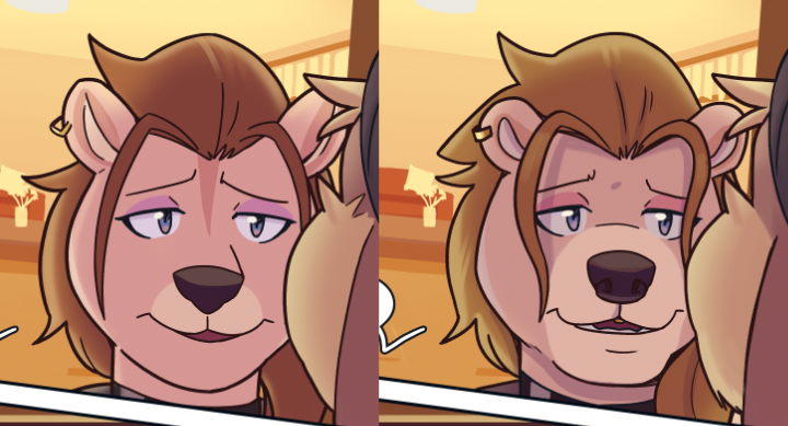 Ruby's edges have been sanded off a smidge. Instead of her calling Basil a creep, I just have her be surprised. I also changed Abe's expression here to be more clearly "in love."