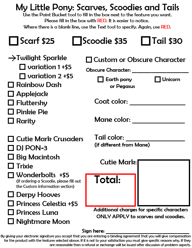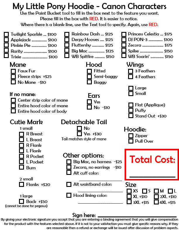 If you are going to be ordering a hoodie and matching tail, you can just write "hoodie" as it is an option on the order form. If you are ordering a hoodie and a tail that is separate from the hoodie's character (i.e. a Rainbow Dash hoodie and a DJ PON-3 tail) then you should write "hoodie and tail."