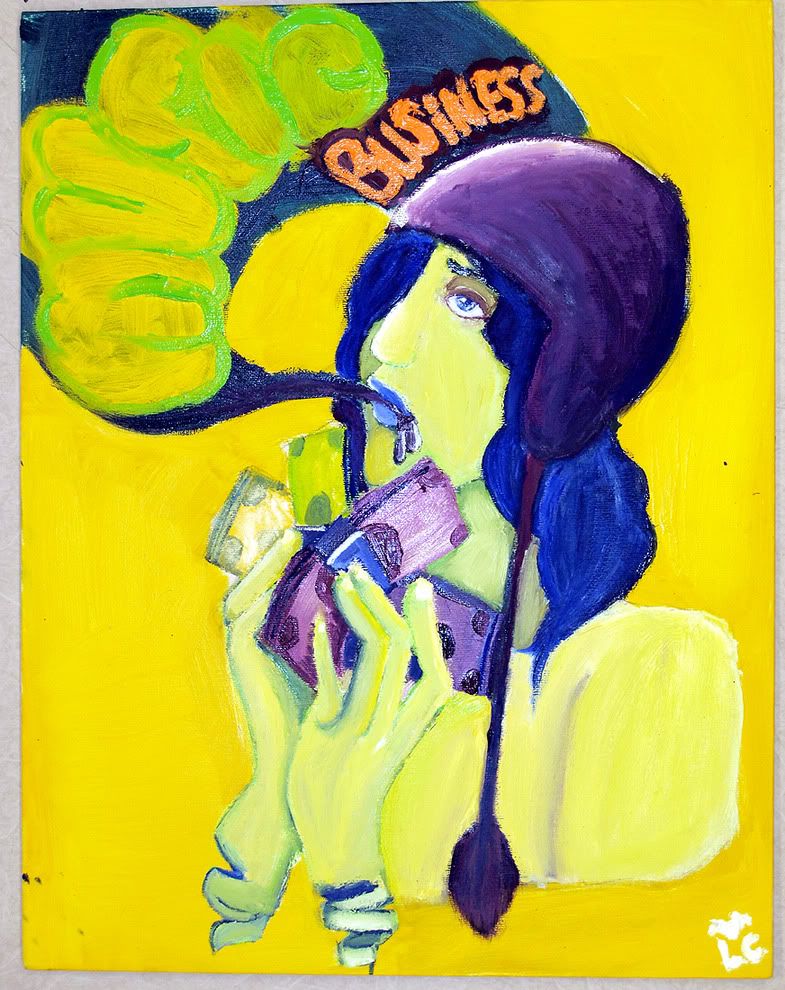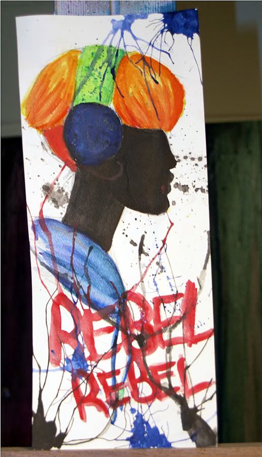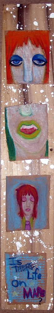 Oil pastels on cardboard pieces, pieces attatched to plank of wood splattered with acrylic paint.