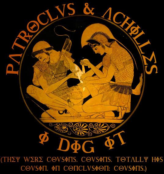 I've done this on a t-shirt as a nice big "F*** YOU" to myMasterworks of Western Lit pre-1500 Older Deader White Guys professor, who is an old, almost-dead white guy himself. Seriously, I think the poor guy's gonna keel over on us one day. Anyway, instead of just ignoring the whole Patroclus/Achilles relationship like a lot of professors will if they're uncomfortable with the implications or just don't want to make a point of it or whatever, this guy states outright that "They couldn't be gay because Homer himself wasn't gay. That's completely a construct of 5th century Athens." Add in a little "la-la-la not listening" every time anyone in class even asked about Patroclus's part in somehow calming the rage of a demigod, or instigating grief so terrible it destroyed half a battlefield when unleashed.