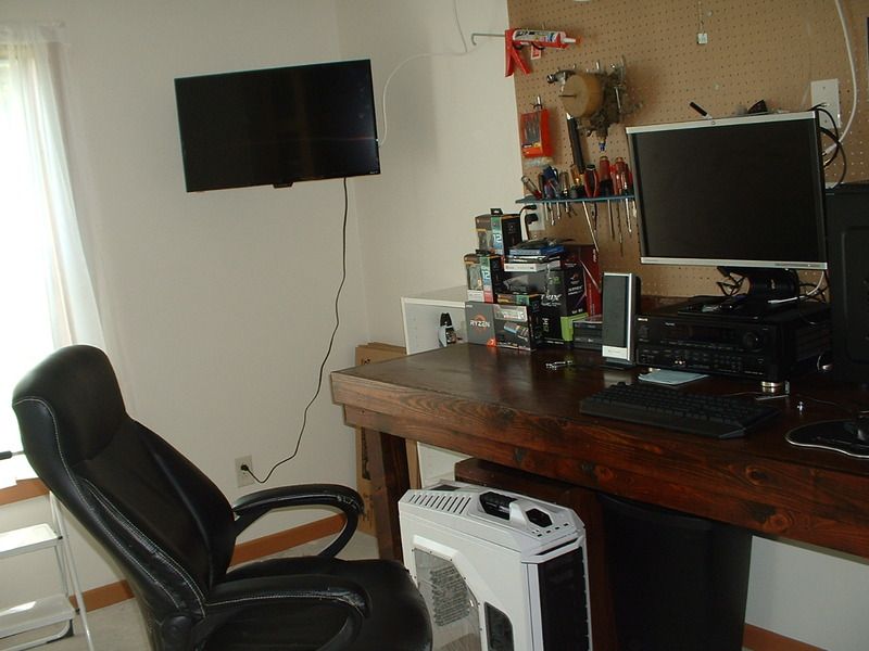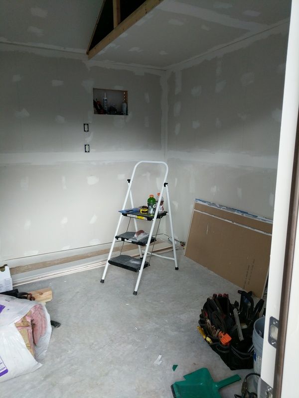 It was finally done in Mid January. I paid Joey for his work and I began to fill the shelves and bring in my stuff from the office. Its not every day that your shed is insulated better than most homes. I had a nice space heater that kept it warm and now in the summer the Air conditioner manages to keep it reasonable when the temps top one hundred outside which is now and normal. I've had electrical and cable run out to it so you can relax and work. Watch TV or listen to the stereo I have now under the work bench. Granted I may some day pay for another modem and line to the shed so I have direct to the net but for now I use wireless from my house I have it boosted with range extenders. So netflix and using the computer is not an issue.