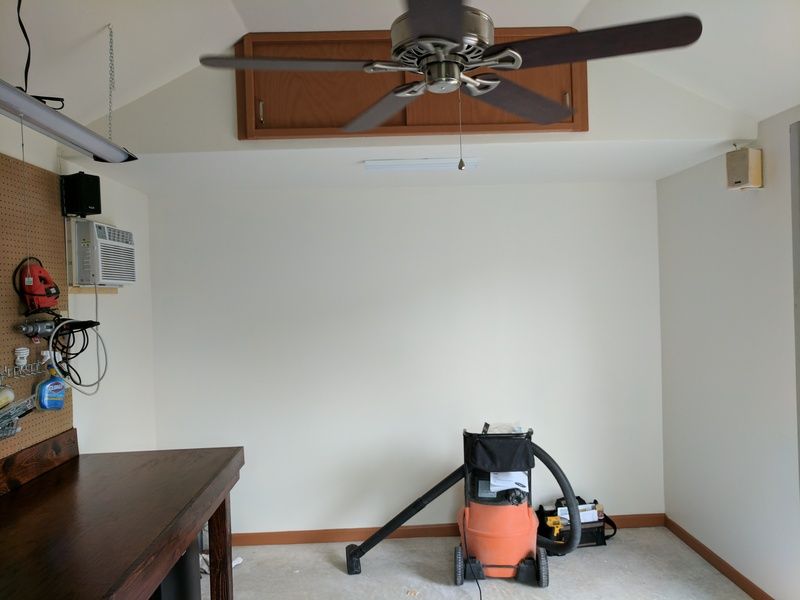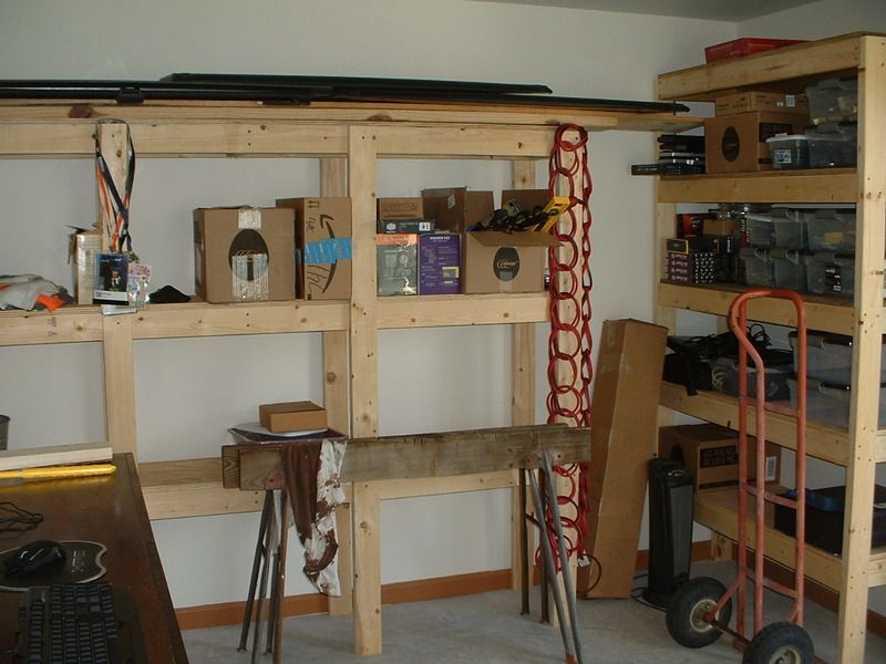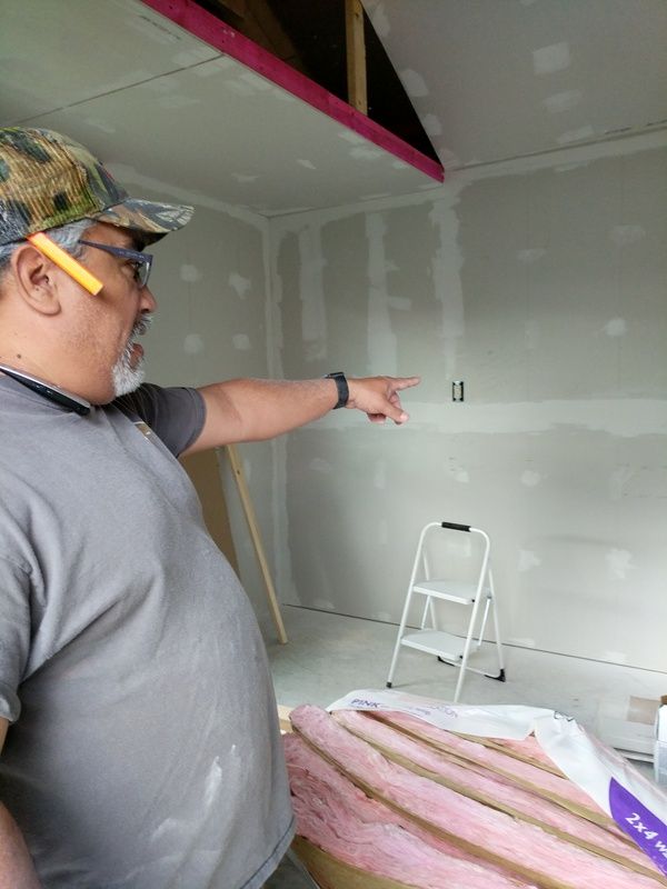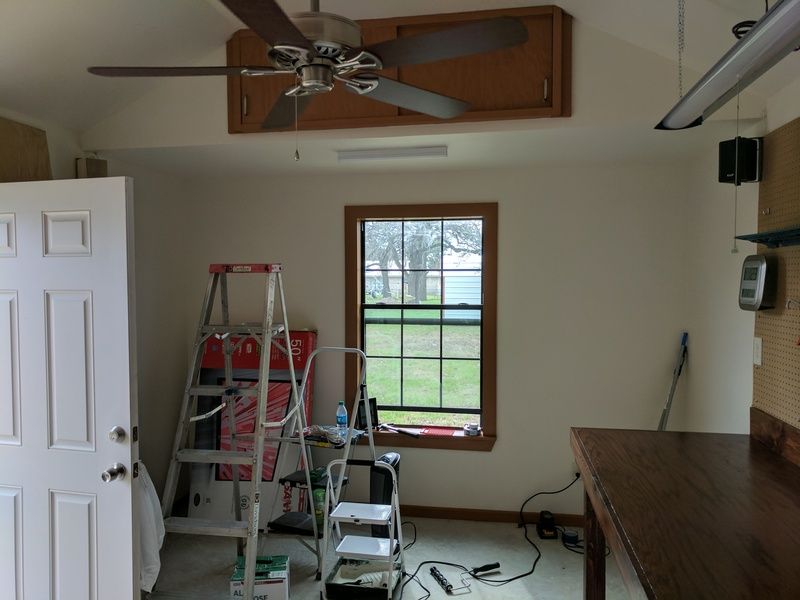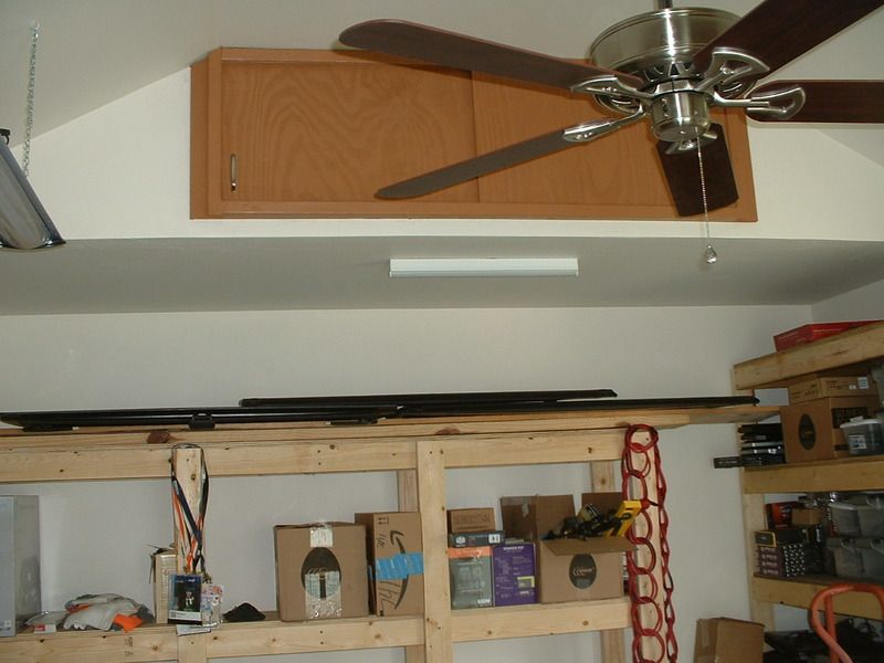 Joey worked more or less Part time. A few hours here and there. Progress was slow and he was a stickler for detail. My idea of overhead storage turned out nice in the end and you could actually lay up there with no worry's about it falling through. I had plywood laid down over the beams.