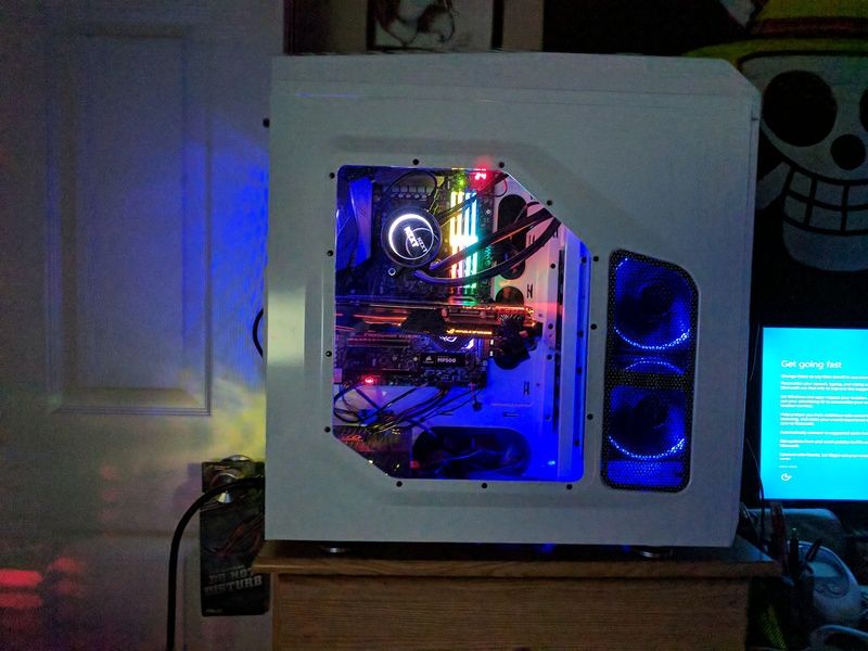 Now I am talking Geek talk mostly about my new system and I wanted something better looking than the last one. The new RGB lighting was out and I decided to do that with mine. The case can handle more fans than you can shake a stick at and I went and ordered Thermaltakes RGB fans four 120 and one 140. I left the two fans on my water cooler it was RGB but it was the cooler attachment to the processes only not the fans but I left that alone. Smiles even my Power supply was RGB so I mounted it facing up to pull air from the case out. So I had eight fans and six of them were RGB. I even purchased the Asus RGB strix ROB 1080 graphics card.