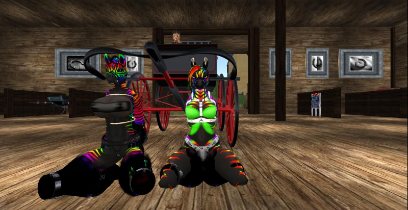 Again I was Influenced by Amelie here on FA and followed her exploits as a pony girl. I liked her Avatar and the gear she used. I had had some RL pony experiences long ago and it kind of kindled the fire again. After a few posts I sent her an Im asking about the gear she used. She was nice and sent me a list and I was beginning my new phase in Second life. I purchased all the items and finally decided on what kind of Pony I would be Since I figured a Pony like avatar would be best I purchased a Rainbow Zebra. A friend what had owned a couple of Ponies took me under her wing and began to train me. I also had a friend that decides to join. I am the one with the green corset on. She took us carting a lot and we were a good and well very colorful team.