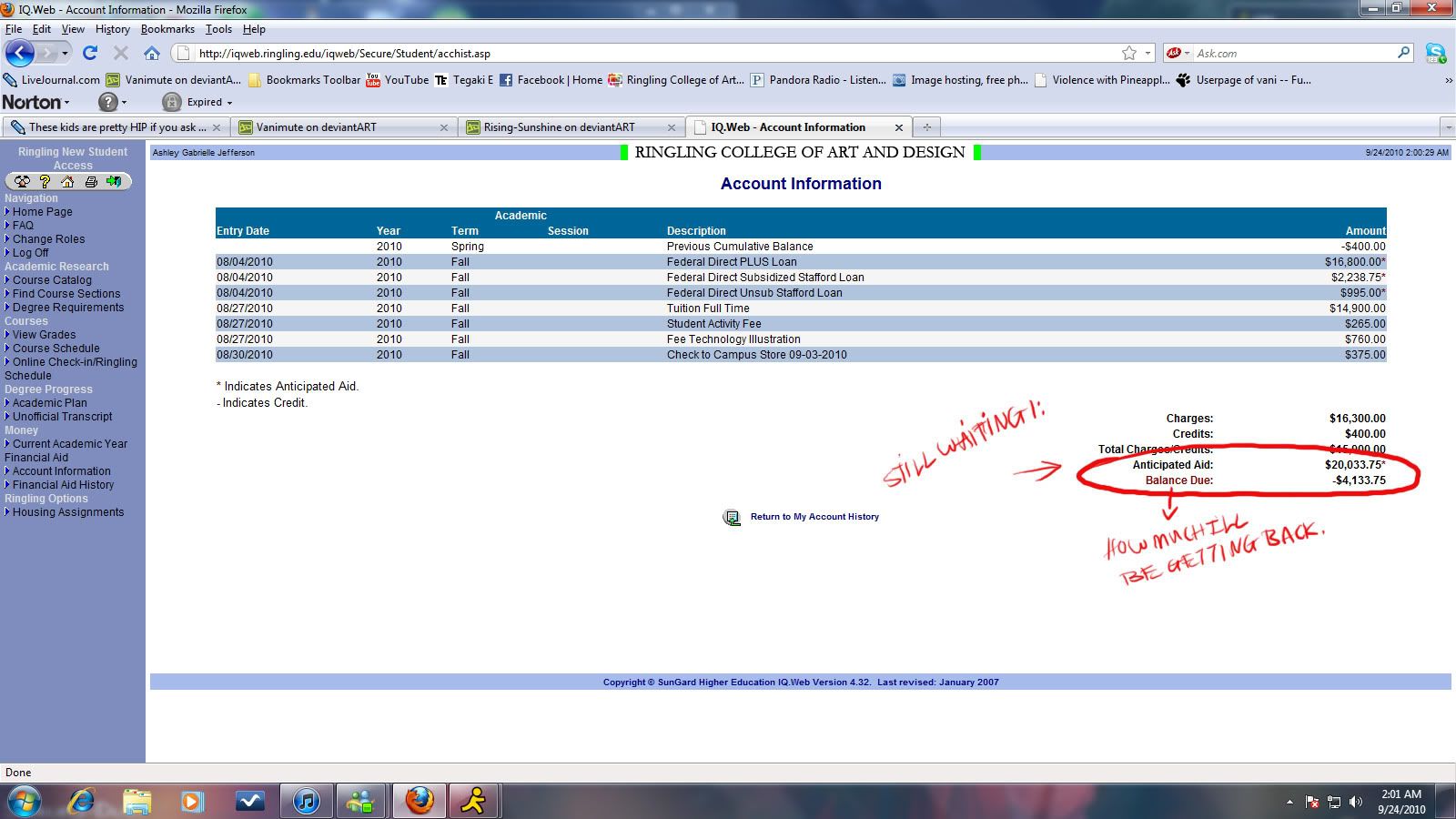 You see, none of this would be a problem if it were possible to get a job and go to Ringling at the same time, but I'm afraid this is a problem and very impossible to do (Just ask anyone who went/goes to Ringling.). My parents don't realize this, they think Ringling is a huge pushover since it's an art school. :/ They're very much in the wrong and it's hard explaining this to them, I even had to get a teacher to talk to them about it. It's really hard for me, because this semester I will be having 4 studio classes, and on top of that, starting a minor and I will probably be in charge of a club this year. So a job is out of the question, and the only thing I could probably manage would be commissions..which I really didn't want to do during the school year, it's very hard getting to them.
