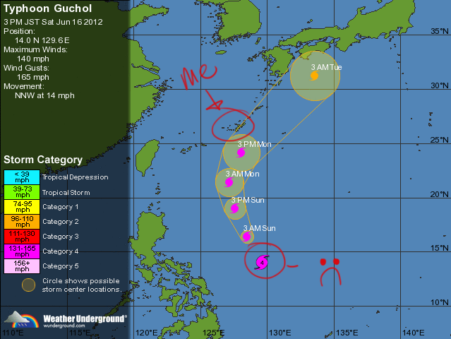 In short, unless this thing make a wicked hook north or south it's gonna hit us head on. I don't have to worry too much. My house is made to withstand these things, and I'm on the high ground which means flooding risk in minimal. So unless a branch breaks off a tree, or some one doesn't secure their outside belongings and one of those things finds it's way through my window, I should be fine. But it's a possibility the power could go out, so I might be gone for a while. I'll be sure to keep you all updated though if and when I can. Of course as soon as my husband deploys we get the biggest typhoon to hit the island in 13 years! Uuuhg!