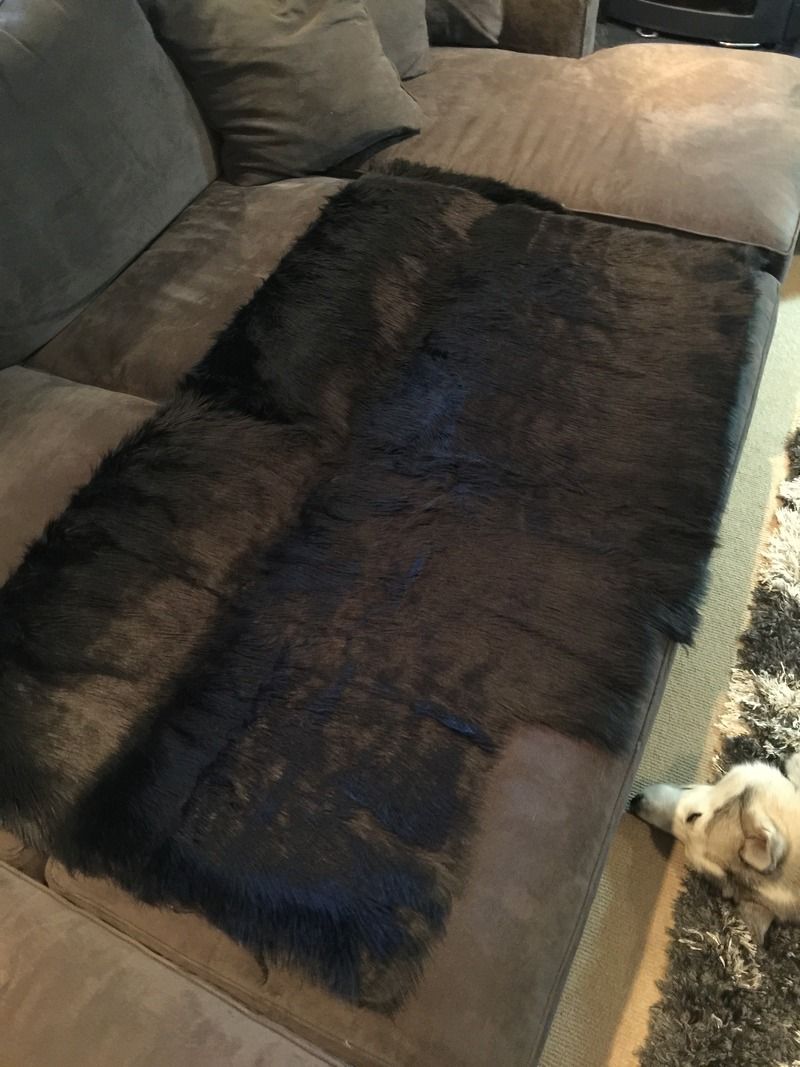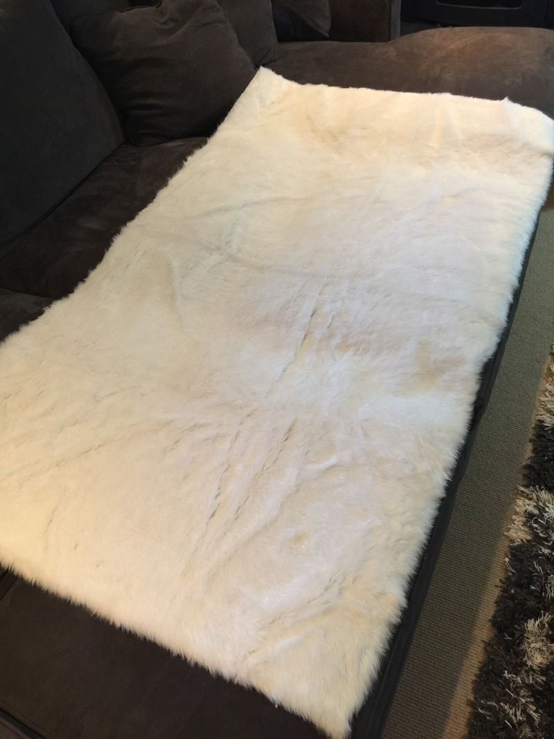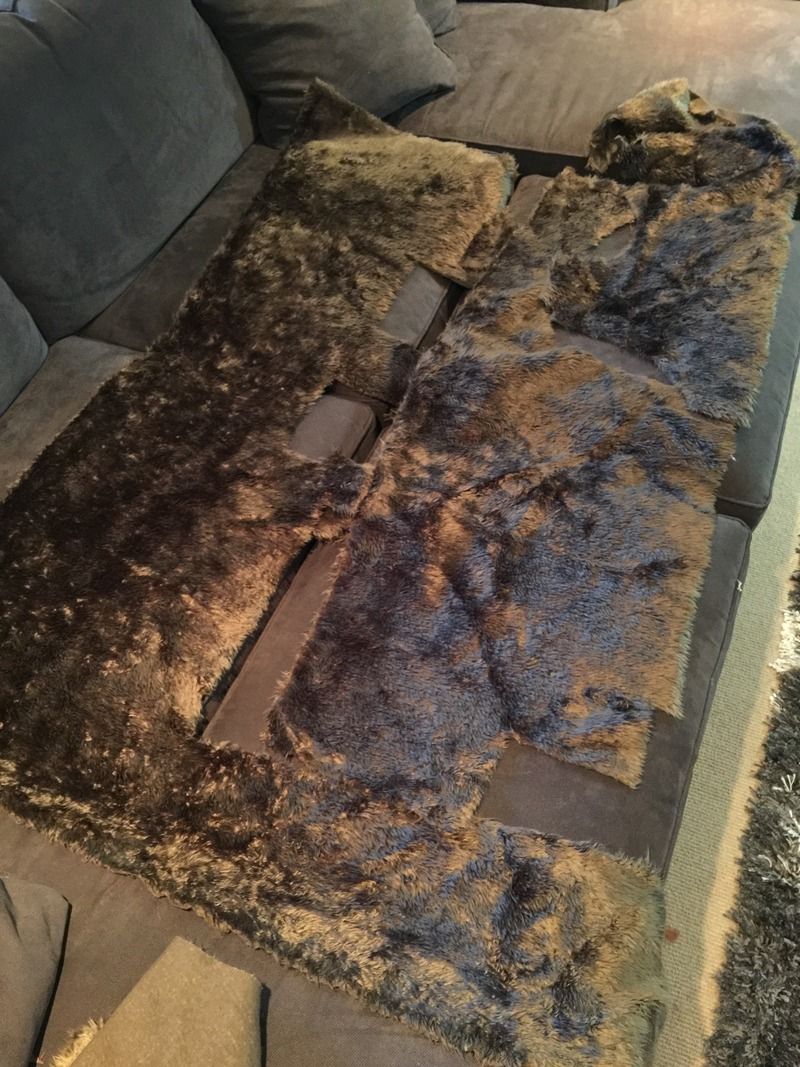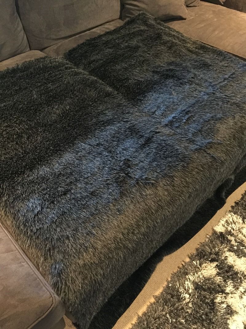 Salt and pepper 60" x 64" (almost 2 yards), pile length about 1". $40. Really soft, great quality, unique black fur with lots of white fibers mixed in.
