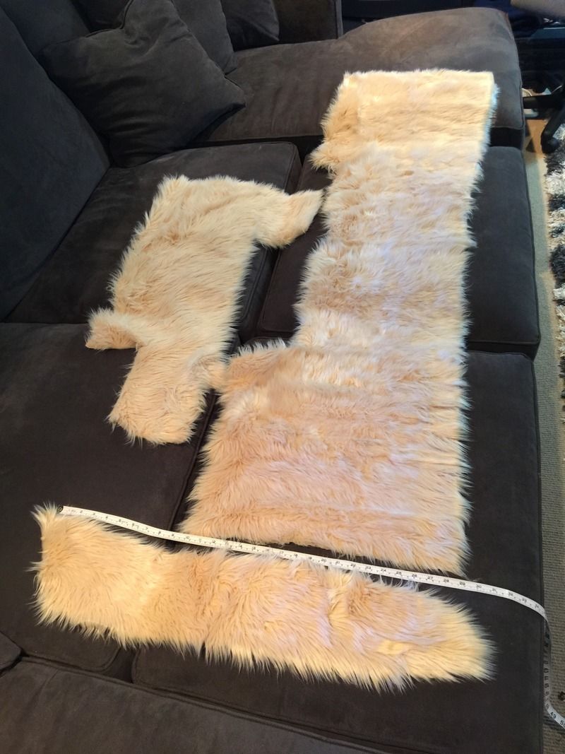 Beige luxury shag scraps. $8. This is from a few years ago, and the dye lot has changed a couple times since then, so this may be useful if you need to match a costume that's 2-3 years (or more) old.