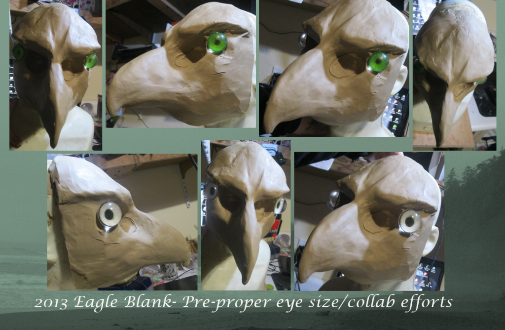 After the initial sculpting process I was struggling a lot with the eye placement (and working with eye blanks that were too small) and the brow-line. I was saving the beak for last when Crys offered to help me finish the blank in a collaborative effort.