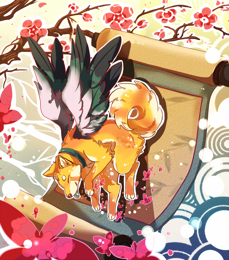 ("the dog is a shiba inu with red panda like markings, it has magpie wings and the sakura blossoms bloom wherever it's feet step.")