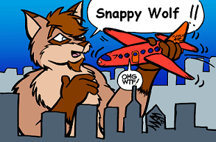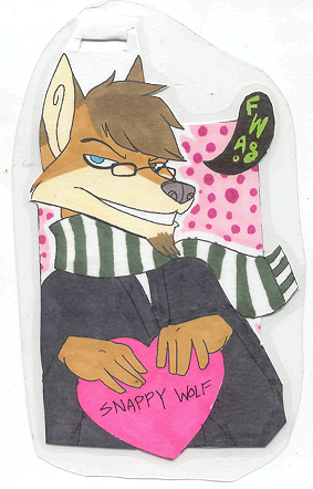 Appearance: Snappy Wolf is 5'7 1/2" tall, his fur is a light tan color with dark brown fox like points. (His ear tips, and paws). His stomach is a very pale almost sand color, as well as the underside of his tail. He has two dark brown circles under his eyes, which are blue (right) and brown (left). He also has a dark brown goatee. He has digitgrade legs, with claws on his feet and hands. His nose is black.