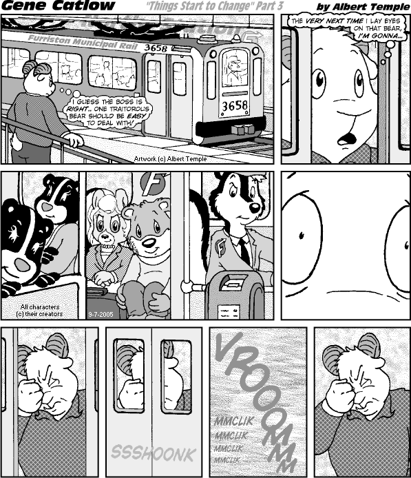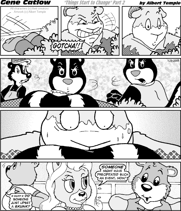genecatlow: 's webcomic, a diminutive bear named Eubie thwarted the plans of a hateful "Furry Unity" group and nearly paid with his life. Since then, a Furry Unity thug named Bigley has sought to finish the job, but the ram's revenge has been repeatedly repelled by a certain skunkomotive!