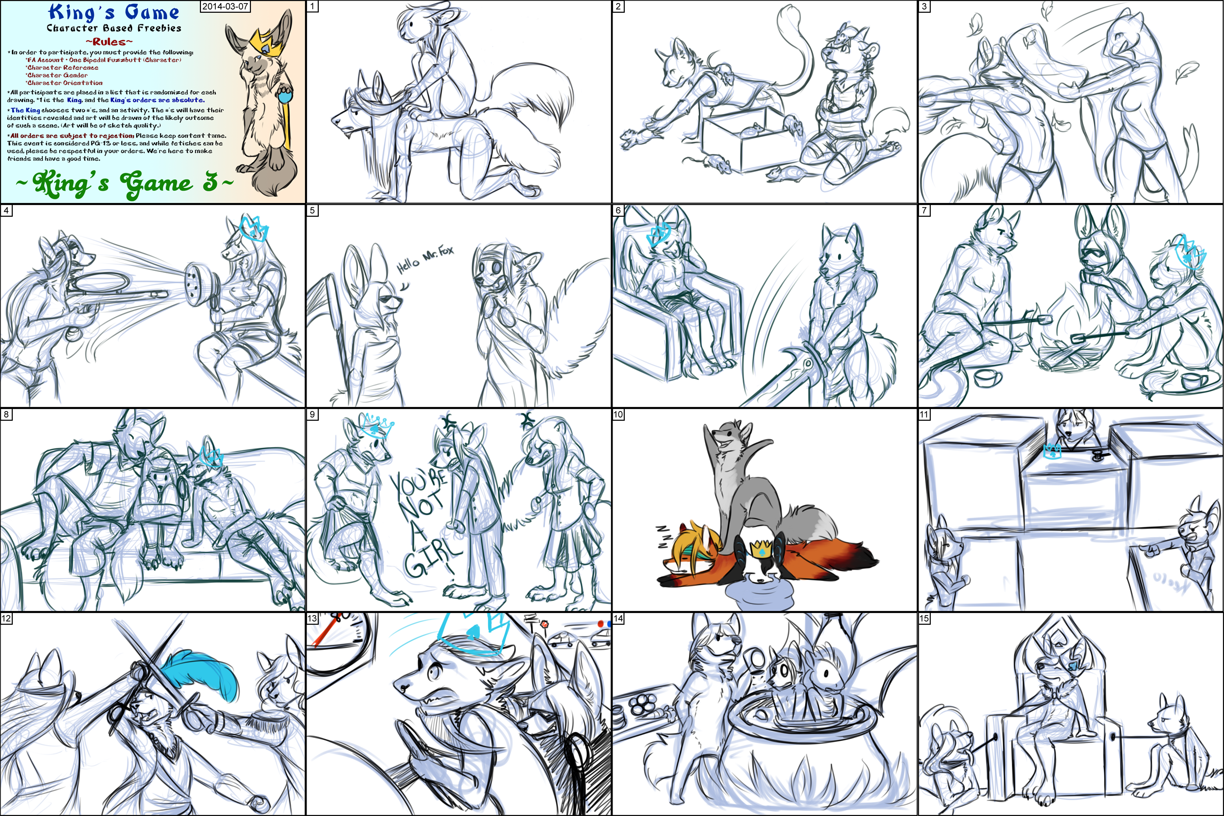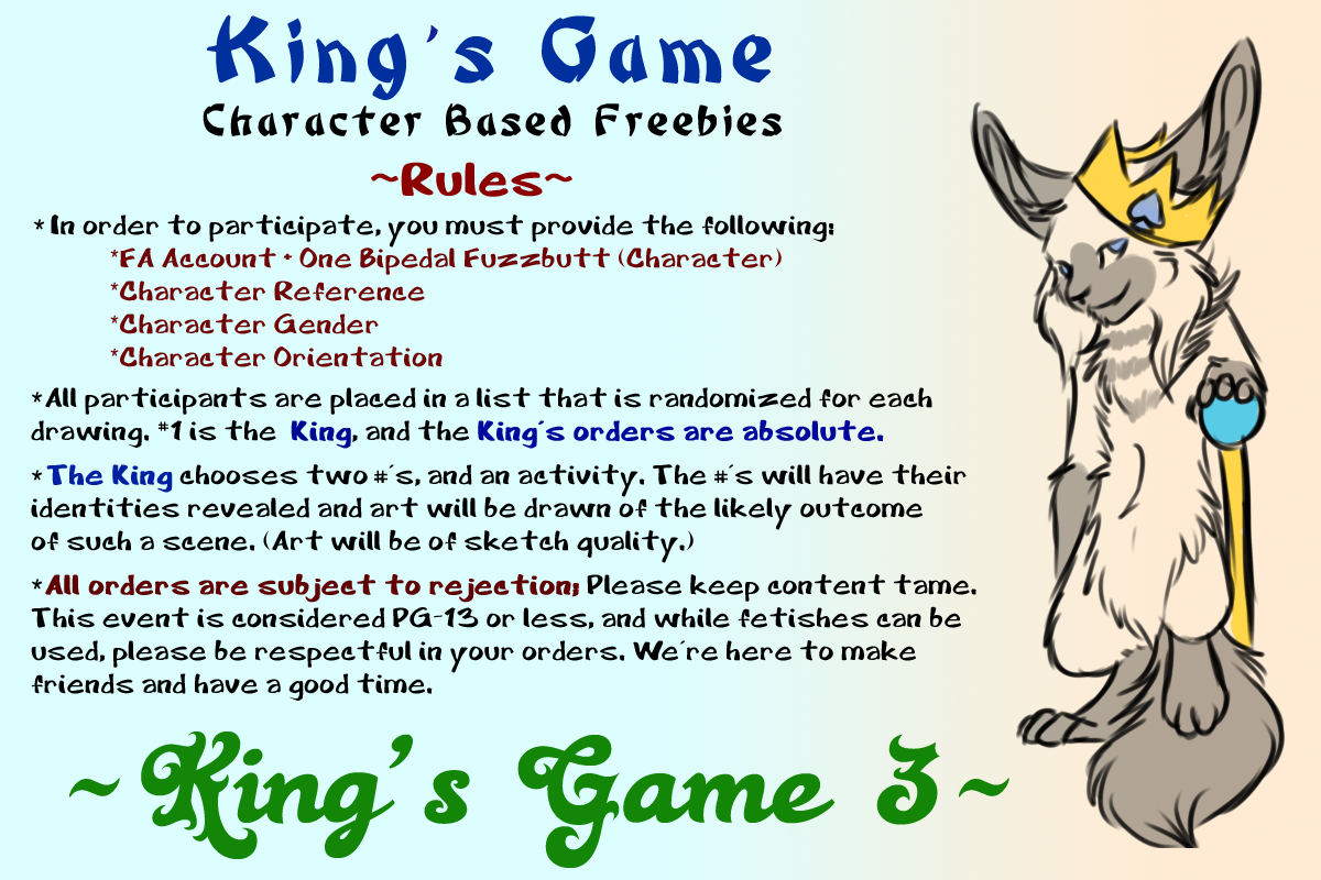 Tobias: It's been over a year since we first hosted the King's Game. This marks a hopeful return for the event, as Game #3 here ended up with a whopping 24 participants. We did a total of 15 rounds, with many of them utilizing three people instead of the usual two. "Viewer#" count was up to 59 when we ended, hahaha. That's a lot of people over the course of the night.
