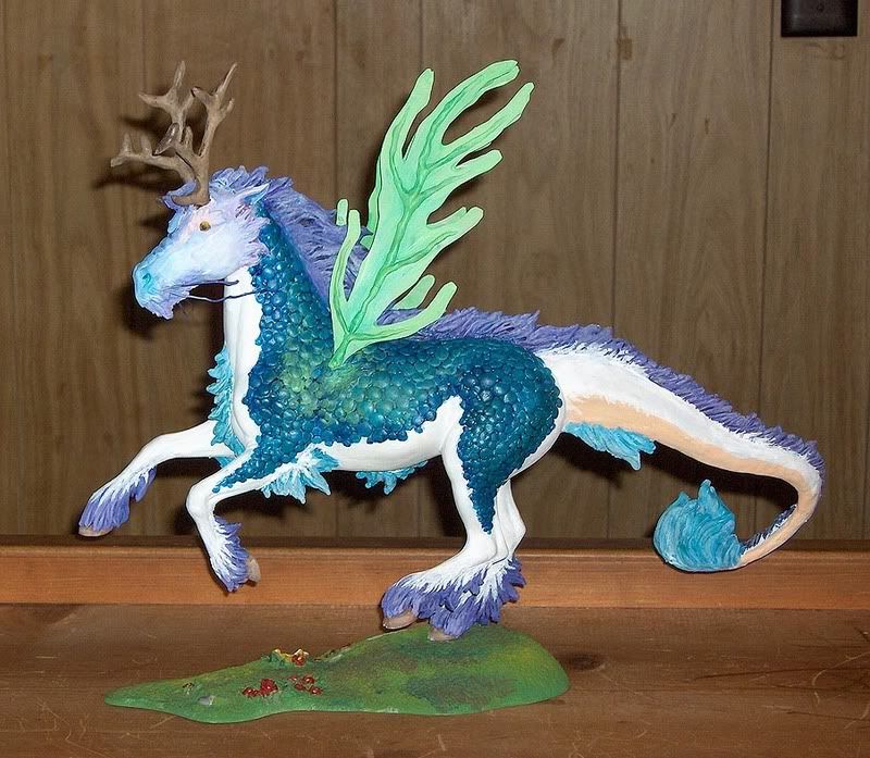Oh god, that tail was a pain in the butt from the start. He actually has a bit of history before he got to this point. The tail is wire enforced, with foil armeture,sculpted with a very durable material. In all, the tail is pretty durable, but met the untimely fate of an evil monster called USPS. He was shipped out to a friend who was going to show him (yes, yes, i know. They do make model horse shows like real horse shows). He'd gotten beaten up pretty bad, and came home with a missing antler and his tail was cracked in two places.. It was difficult to repair the tail (and managed, thank goodness!). Repairs, resculpts and repaints later, he ended up like this, as requested by the commissoner :}
