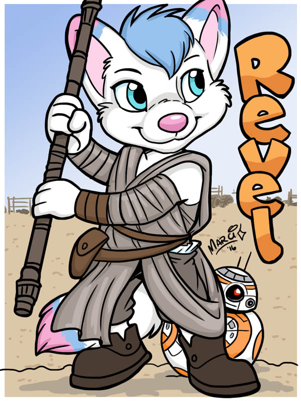 Revel is cosplaying Rey from StarWars VI in his first ever Marci Badge (which has me just a little excited).