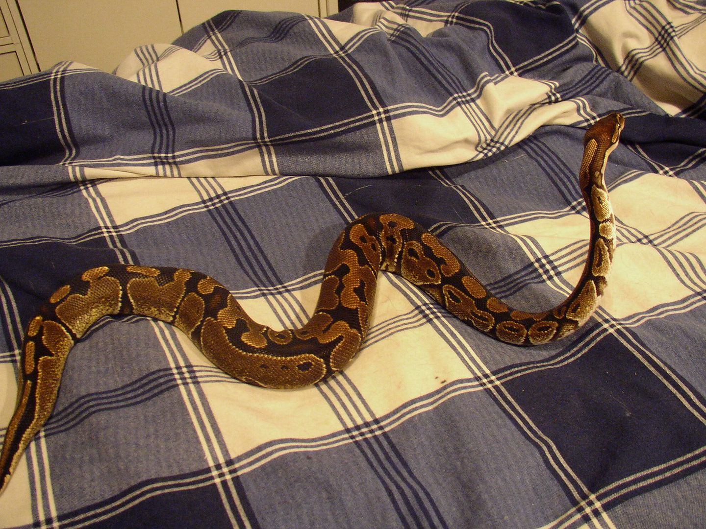 this is my ball python, Sniffie. He's been refusing food lately, but he shed the other day and accepted a rat, so I'm happy. I took this photo a while back but I felt like sharing :>