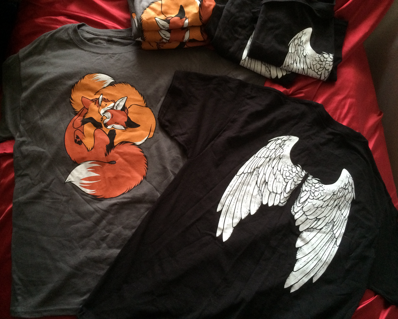 Available are WING SHIRTS and FOX SHIRTS. Both are made with real screenprinting (not direct to garment or iron on). I only produce a few of these and thus far they have been exclusively available at conventions. This is the first time you can buy them online! When the stock is gone, it's gone! I don't know if I'll be doing another print run of either design next year.