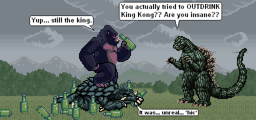 Another one about kaijus and imbibing massive amounts of alcohol. This time it's Godzilla having one too many, with Kong (presumably) just getting started. The basic idea is that Kong's legendary drinking prowess is seen as a challenge to many of his fellow kaiju, which they try to outdo.