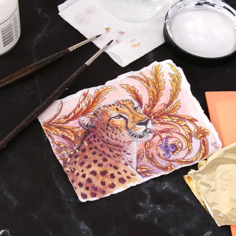 A cheetah portrait on hand made 5”x4” watercolour paper by St-Armand. Created with Daniel Smith watercolour pigments, this was an experiment mixing from 3 colours only ( quinacridone rose, raw sienna, cobalt blue…and a touch bronzite). Bronzite and gold leaf accents make this piece shimmer in the right lighting. It took several hours to get those little details in.
